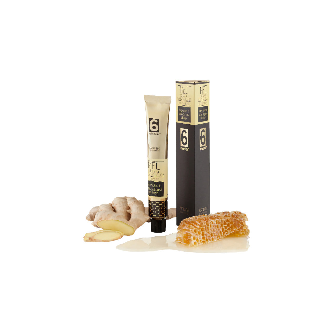 Um mel gourmet colhido nas encostas e vales da Serra da Lousã, predominantemente de urze (monofloração). Este mel de montanha tem forte personalidade, sabor marcante, ligeiramente acidulado, e consistência densa, apresentando um tom muito escuro e âmbar. O toque de gengibre acrescenta aroma e sabor levemente picantes, em harmonia com a ligeira adstringência típica do néctar de urze.