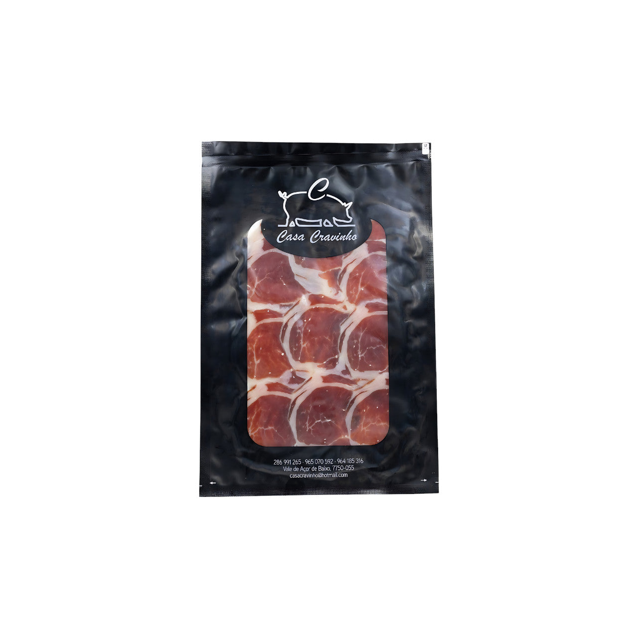Presunto de porco preto 100 % bolota, proveniente de animais criados em regime extensivo no montado alentejano. Fatiado com precisão, este presunto representa a excelência da tradição artesanal portuguesa.